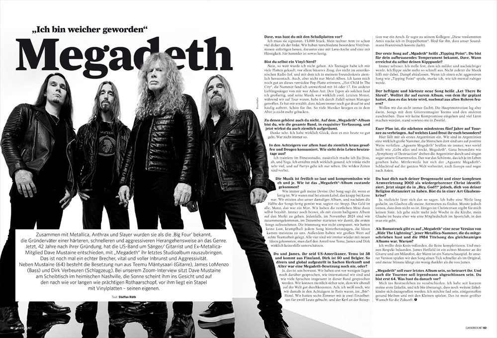 Zusammen mit Metallica, Anthrax und Slayer wurden sie als die ‚Big Four‘ bekannt, die Gründerväter einer härteren, schnelleren und aggressiveren Herangehensweise an das Genre. Jetzt, 42 Jahre nach ihrer Gründung, hat die US-Band um Sänger/Gitarrist und Ex-Metallica- Mitglied Dave Mustaine entschieden, mit MEGADETH ihr letztes Studioalbum rauszubringen. Das ist noch mal ein echter Brecher, vital und voller Inbrunst und Aggressivität. Bei unserem Zoom-Interview sitzt Dave Mustaine am Schreibtisch im heimischen Nashville, die Sonne scheint ihm ins Gesicht und auf den nach wie vor langen wie prächtigen Rothaarschopf, vor ihm liegt ein Stapel mit Vinylplatten – seinen eigenen. Lest hier unser Interview mit Dave!